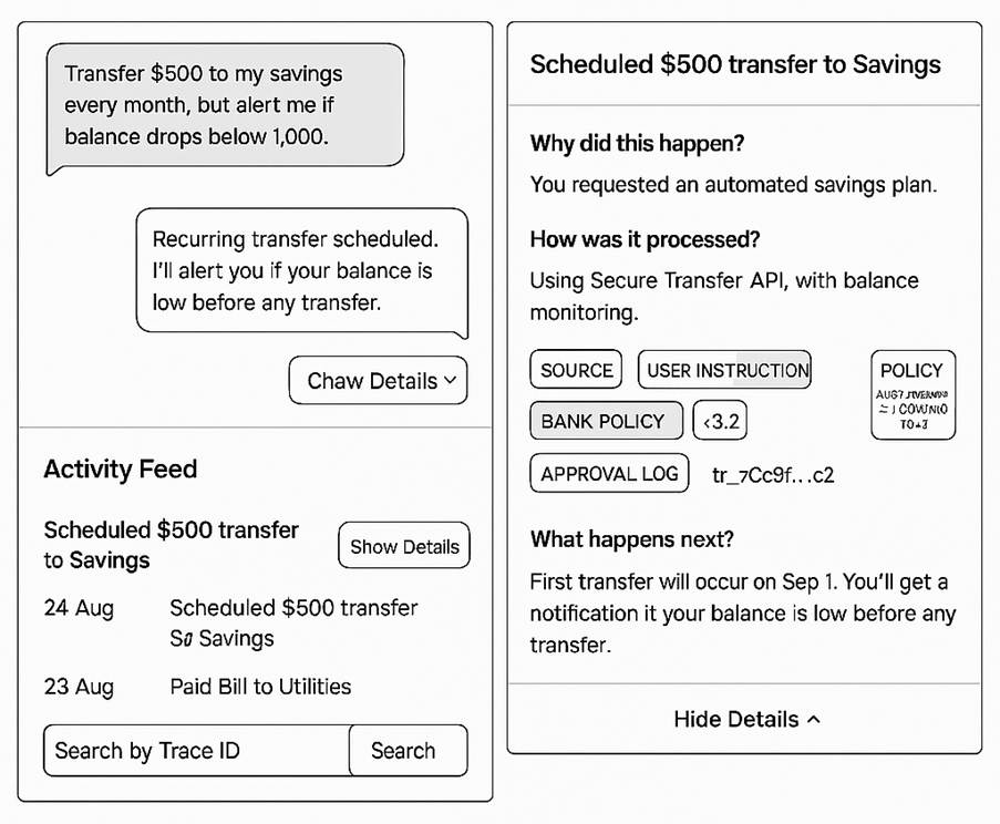 From a user experience perspective, instruments of trust should be surfaced through clear explanations of why and how decisions were made, and what happens next. This can be achieved by displaying source chips, policy badges, and providing users with a copyable trace link for every significant action.