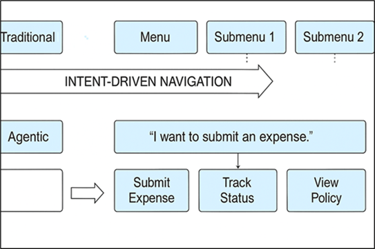 Menus are no longer static lists; they become conversational and adaptive. Agents can offer quick actions, sometimes called “suggested actions”, within chat, voice, or UI cards. For example, after a user asks about expenses, the agent might display options like [Submit Expense] [View Policy] [Track Status].